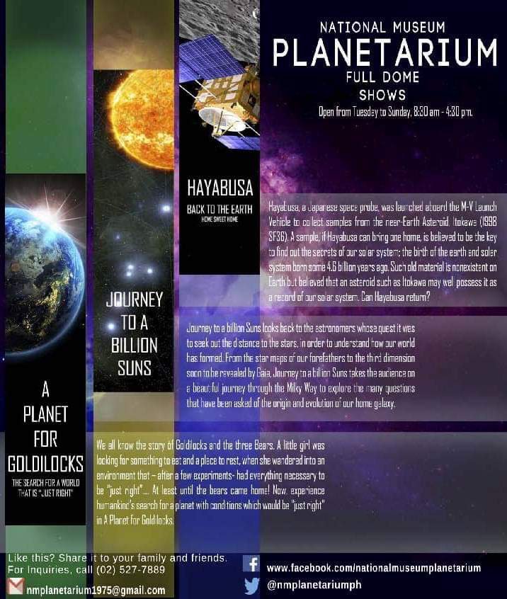 📍Mayroon three shows: “A Planet for Goldilocks,” “Journey to a Billion Suns” and “Hayabusa: Back to the Earth.”