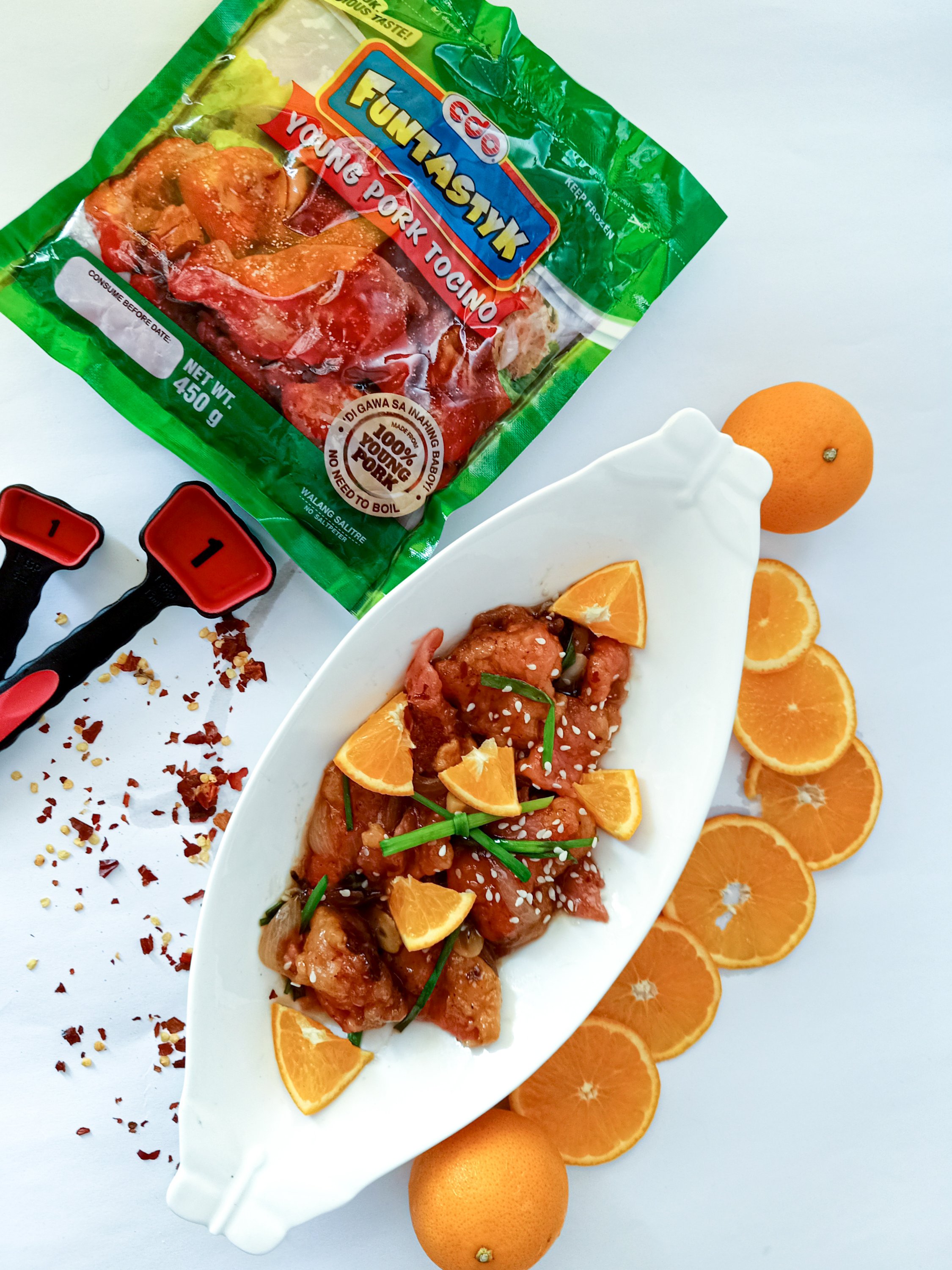 Toss Tocino with orange sauce. You may reserve some of the sauce to place on rice.