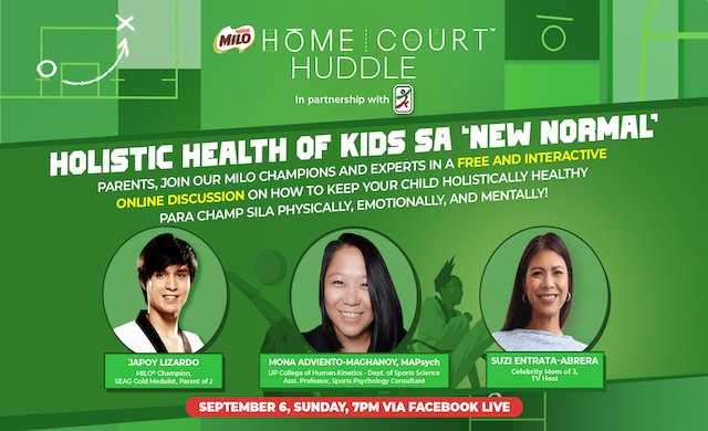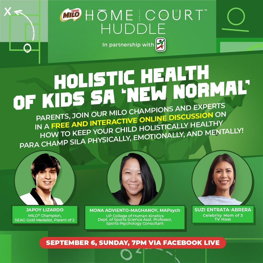 MANILA, Philippines, 4 September 2020 – As parents and kids gear up for a new school year, they are faced with many adjustmtments during these challenging times. Today, online learning has become the norm; home is the new school and video confrerences are the new classroom. With its commitment to nourishing champion ambitions in sports and in life, MILO is set to hold the MILO Home Court Huddle – an insightful and helpful parenting webinar to talk about the “Holistic Health of Kids sa ‘New Normal’”, tackling how today’s young champions can be physically, mentally, and emotionally well, even at home.