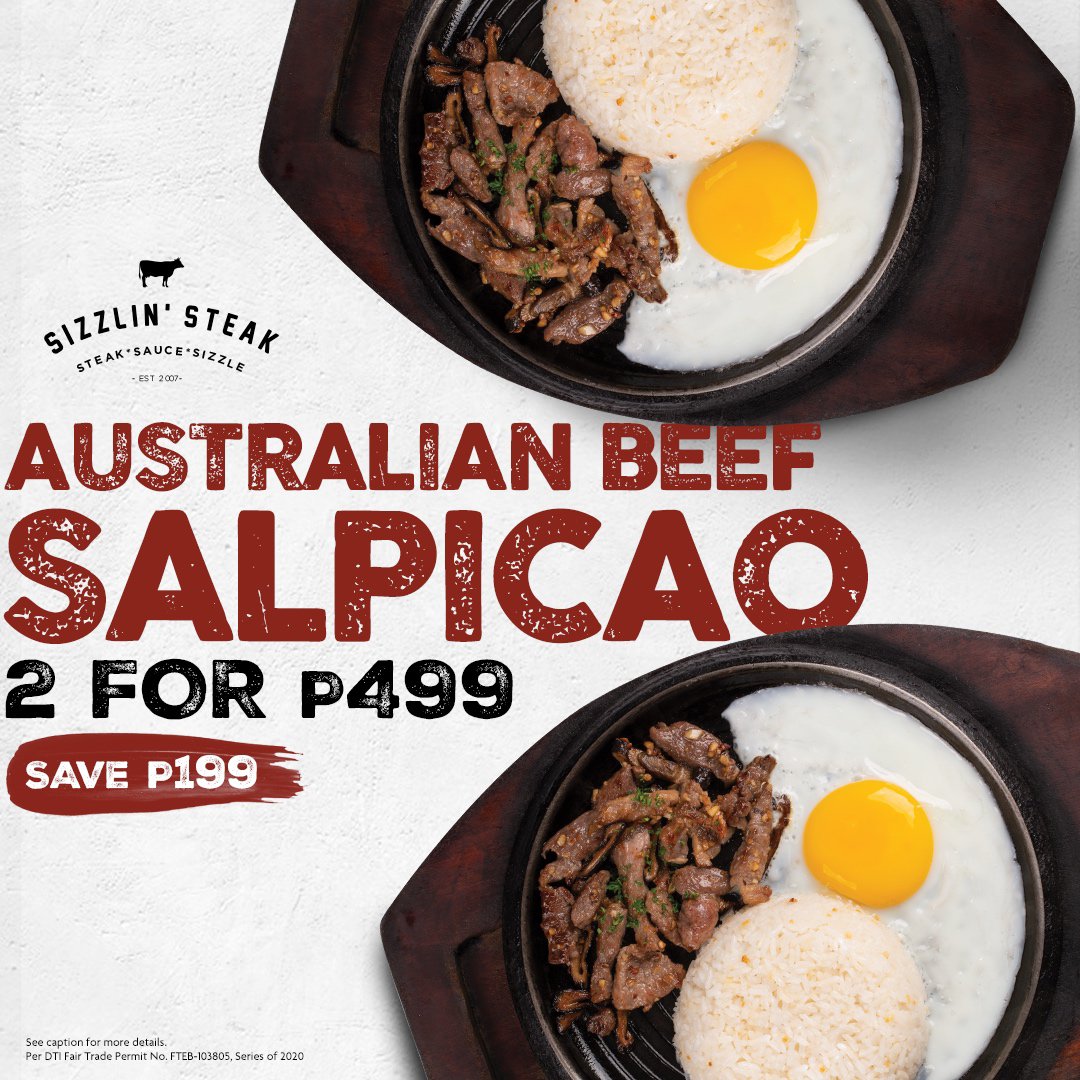 Good things come in twos – especially with Sizzlin’ Steak’s Beef Salpicao Duo. For only 499, enjoy two orders of mouth-watering and tender Australian Beef Salpicao with an explosion of salty, sweet and garlicky flavors served with plain rice and egg.