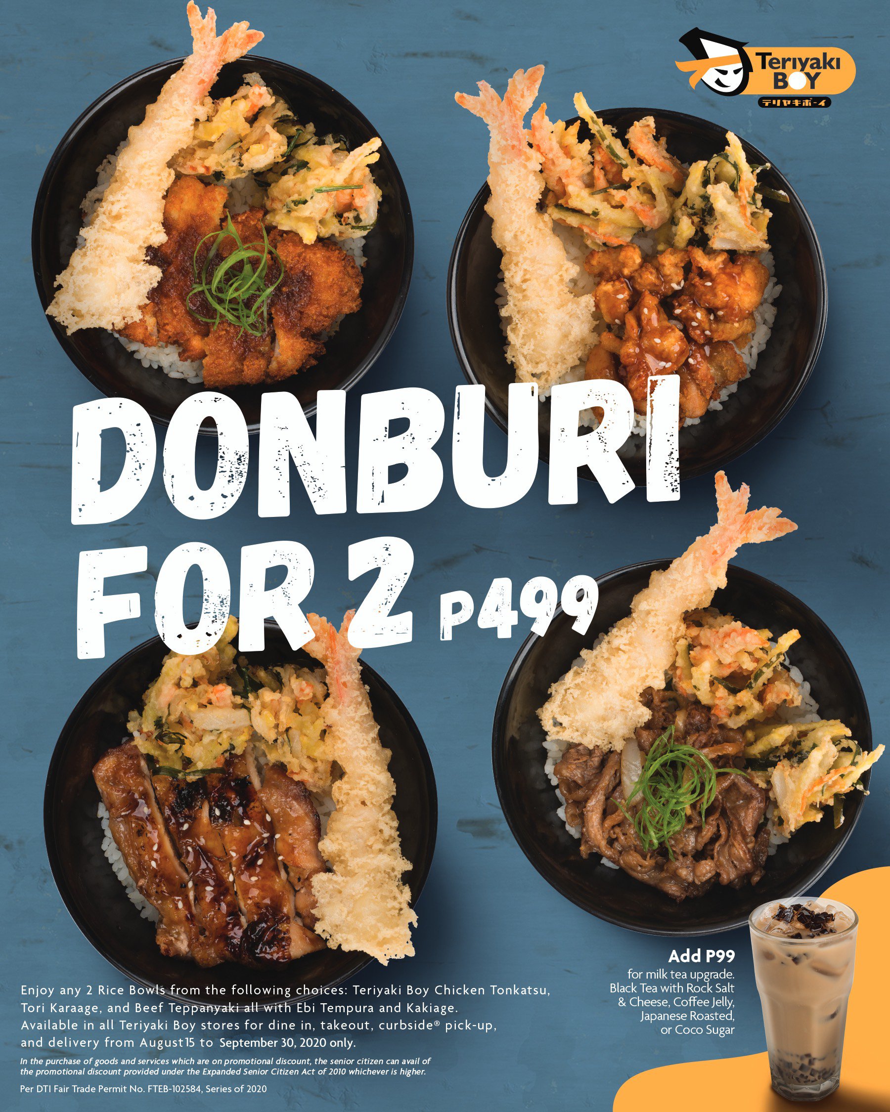 For only P499, Teriyaki Boy’s Donburi for 2 lets you enjoy two rice bowls from the following choices: Teriyaki Boy Chicken Tendon, Tonkatsu Tendon, Tori Karaage Tendon, and Teppanyaki Tendon.