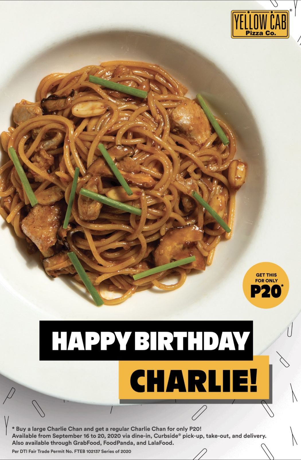 Join Yellow Cab in singing “Happy Birthday Charlie” as it celebrates the birth of its iconic pasta dish – the Charlie Chan®️. From September 16, 2020 to September 20, 2020 buy a Large Charlie Chan®️ and get a Regular Charlie Chan®️ for only P20!