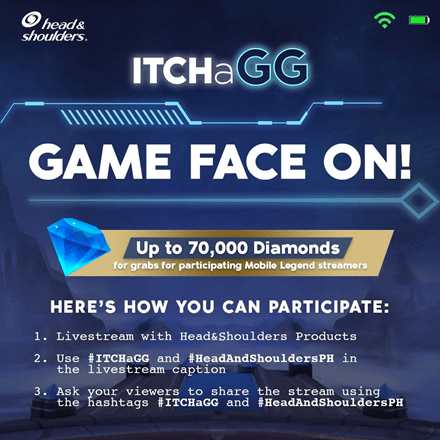 Head & Shoulders, in partnership with Mobile Legends, presents #ItchaGG — your chance to win 70,000 ML diamonds. All you need to do is livestream a game of Mobile Legends with Head & Shoulders products, use the hashtags #ItchaGG and #Head&ShouldersPH as part of the livestream caption, and do a shoutout to your streamers to share the stream with the hashtags.