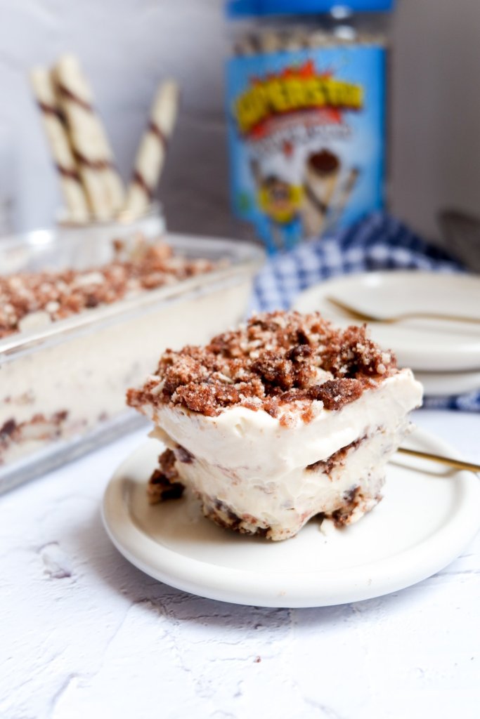 The ingredients are layered together and allowed to set in the refrigerator. Mushy wafer may sound weird, but trust me it works! It’s sweet, light and fresh without being too sugary.