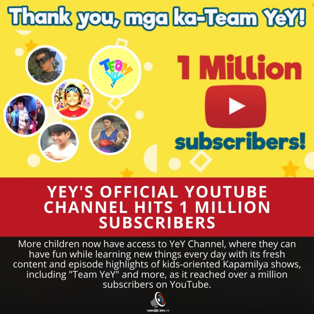 More children now have access to YeY Channel, where they can have fun while learning new things every day with its fresh content and episode highlights of kids-oriented Kapamilya shows, as it reached over a million subscribers on YouTube.