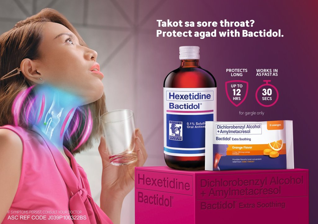 “Going out in the new normal, we need to make sure that we are ready with our everyday essentials — may it be bringing alcohol, wearing your mask, or having medicine with us in case of emergencies. This also entails being ready when we are faced with early signs of a sore throat that may develop into something worse. (Hexetidine) Bactidol gargle helps protect you from sore-throat-causing viruses because it gives you up to 12 hours of protection and can soothe your throat in as fast as 30 seconds.” – Chili Perez, senior brand manager for J&J Philippines