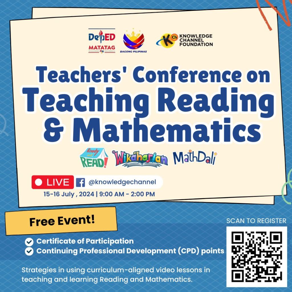 As schools prepare for the opening of SY 2024-2025, the Knowledge Channel Foundation, Inc. (KCFI), celebrating its 25th anniversary, will host its first Teachers’ Conference on Teaching Reading and Mathematics with Wikaharian, Ready, Set, READ!, and MathDali. The conference is free and will merit participants with a Certificate of Participation and Continuing Professional Development (CPD) points for their professional expertise. It will be streamed live via Knowledge Channel’s Facebook page on July 15 and 16, from 9:00 AM to 2:00 PM in time with the Department of Education’s National Learning Camp for teachers.