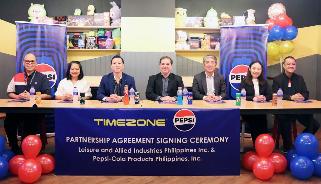Pepsi-Cola Products Philippines Inc., (PCPPI) and Timezone bring family fun to new heights with a strengthened partnership. PCPPI and Timezone, operated by Leisure and Allied Industries Philippines, Inc., recently renewed their business partnership, which will see well-loved beverages such as Gatorade, Mountain Dew and Pepsi served across Timezone’s 49 venues nationwide. Present during the signing ceremony were (from left to right): PCPPI Customer Development Manager Jeff San Jose, Leisure and Allied Industries Philippines Inc. executives Business Development Manager Ana Liza Benitez, Chief Commercial Officer Juan Miguel Crisostomo, President and General Manager Rafael Prats Jr., PCPPI Chief Commercial Officer Lyndon Cuadra, Leisure and Allied Industries Philippines Inc. Chief Finance Officer Jocelyn Bautista, and PCPPI Region Commercial Head – National Key Accounts Food Service Alex Catindig.