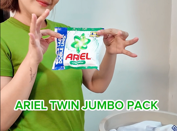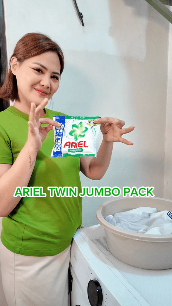 “Buti na lang nandyan ang Ariel Twin Jumbo Pack to the rescue,” she said in the video. “Subok na talaga namin ‘to sa pagtanggal ng tough stains. Kayang-kaya in just one wash.”