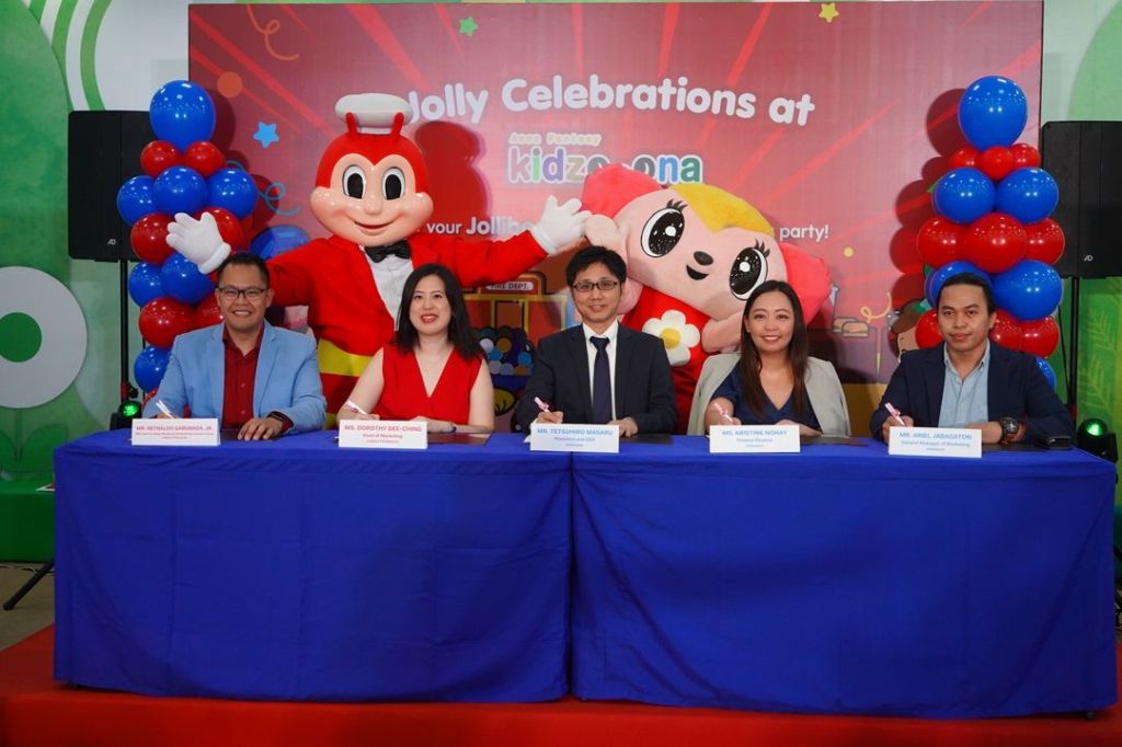 (L-R) Kakam Gabunada, Jr., RBU Head for Mega Manila and National Key Accounts Group, Dorothy Dee-Ching, Jollibee Head of Marketing, Tetsuhiro Masaru, kidzooona President and CEO, Kristine Nohay, kidzooona Finance Director, and Ariel Jabagaton, kidzooona General Manager of Marketing officially the official partnership, with Jollibee becoming the exclusive fast food partner.