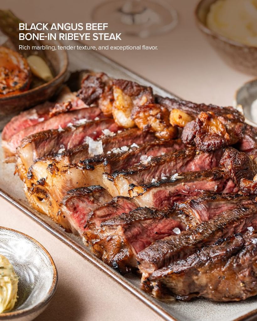 The Black Angus Beef Bone-In Ribeye Steak at One World Deli in MOA Square features a tender texture and outstanding flavor due to its abundant marbling.