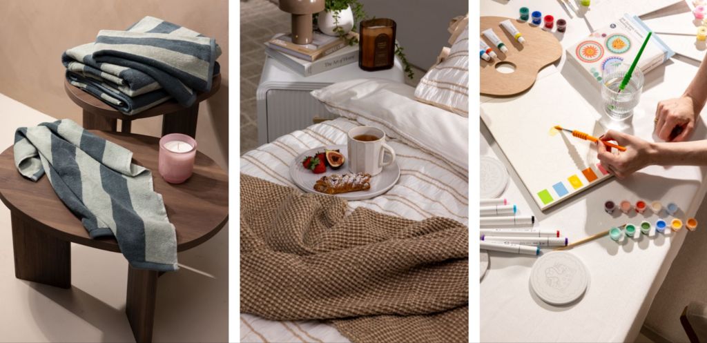 A self-care night is the perfect way to escape the everyday rush and relax with mom. The evening reset begins by wrapping up in plush Stripe Cotton Bath Towels (₱530) after a good bath, perfectly paired with a warm cup of tea or coffee served in the elegant Petal Mug (₱160). With the calming scent of a Floral Orchard (₱350) or Sandalwood Musk Reed Diffuser (₱350) and the warm glow of a Selfcare Glass Candle (₱350) lingering in the air, the room is instantly transformed into a quiet sanctuary. The night beautifully closes out by reflecting on the day with A5 Hardcover Journals (₱290) and slipping on a Bodycare Eye Mask (₱130) for a more comfortable night’s sleep, creating the ideal ambiance to appreciate every quiet moment with loved ones.